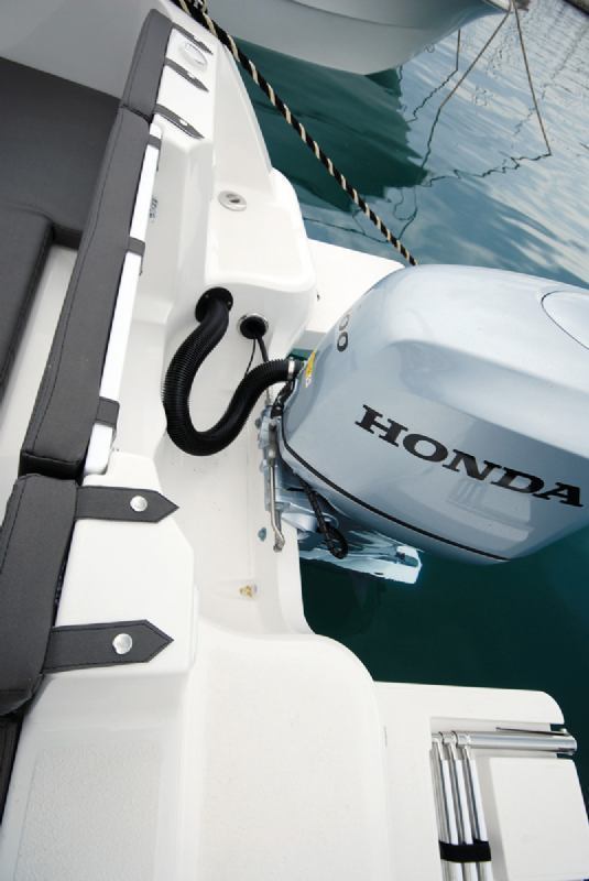 Na krmi, iza klupe je motor. Honda od 100 konjskih snaga. Za ovo plovilo proizvođač kaže da je 100 konja maksimalna preporučena snaga, što je i prema našem iskustvu više nego dovoljno za ovaj gliser. Sa svake strane motora su prilično velike platforme, a na jednoj su ugrađene sklopive ljestvice. Sve skupa je vrlo dobro izvedeno. Ljestvice su upuštene u platformu, a na boku iznad je malo veći rukohvat za pomoć kada se preko njih penjemo u brod.