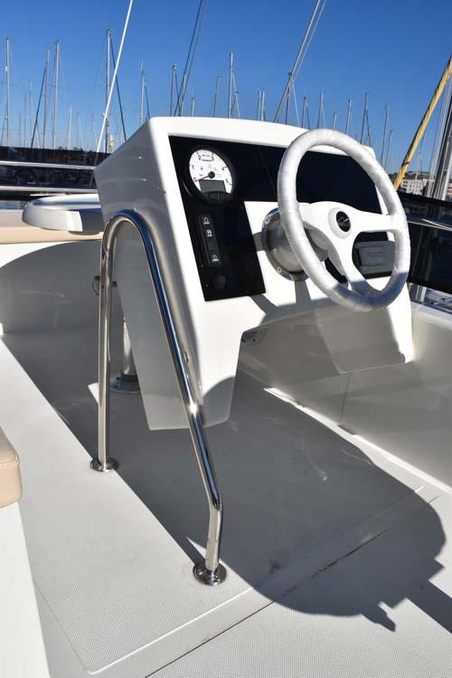 Posebno interesantnim nam se učinio kokpit. Izveden kao podest koji je kao balkon izvučen na krmi, kokpit je definitivno predimenzioniran. Osim što je izvučen s krmene platforme, on je i proširen te dvadesetak centimetara izlazi iz širine bokova. Kokpit je zapravo objedinio u priču i krmenu platformu, gdje je cijeli prostor pretvoren u veliku terasu ograđenu inoks ogradom. Kako je jedini smisleni ulaz na plovilo preko krme, jer za ulaz preko pramca treba zakoračiti na vodilicu sidra, tako je ograda na krmi otvorena na tri mjesta. Dva su ulaza na bokovima, naravno zaštićena gumiranom inoks sajlicom s elastičnim karabinom s otponcem, a tu je i treći glavni ulaz, pored kojega je fiksno postavljena preklopna pasarela.