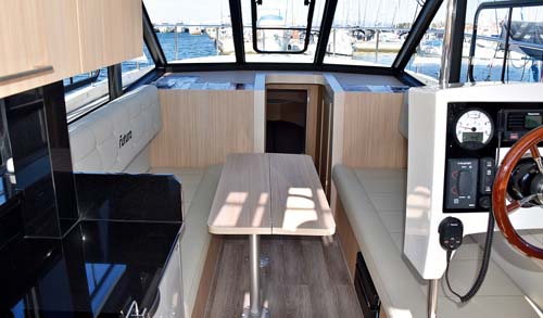 Stol u salonu koji je smješten između klupa preklopan je kako bi se između klupa moglo prema kabinskom dijelu. Salon je u potpunosti ostakljen, te je na bokovima, ali i na pramčanom dijelu opremljen kliznim prozorima. Ako se odlučite na pripremu hrane i hranjenje u salonu, nije daleko od kuhinje i kuhinjskog bloka do stola.