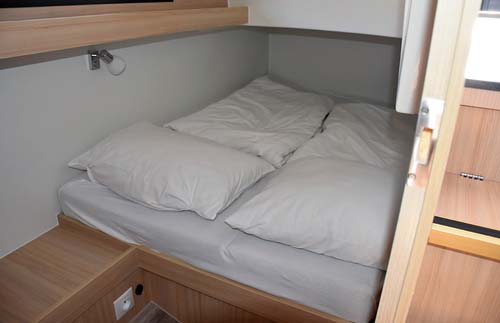 Trokabinska verzija koju smo mi testirali koncipirana je tako da se spuštanjem stepenicama dolazi ispred kabina. Dvije manje kabine nalaze se pod salonom i u unutarnjem dijelu u njima nema stajaće visine. Dio sa stajaćom visinom u kabinama prostran je i bez ograničenja.