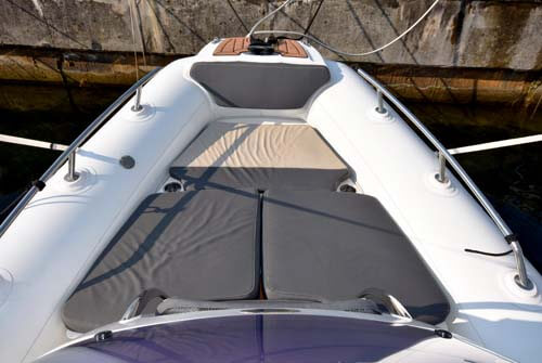 Sklapanje pramčanoga sunčališta zvuči složeno međutim stvar se riješi u tren oka. Uz stol koji je centralni umetak dodaju se dvije bočne platformice koje se fiksiraju onim čudnim vijkom koji smo maločas spominjali, i sve to se prekriva jastucima. Tako se dobije veliko lijepo sunčalište na kojem bi se našlo mjesta i za dvije osobe.