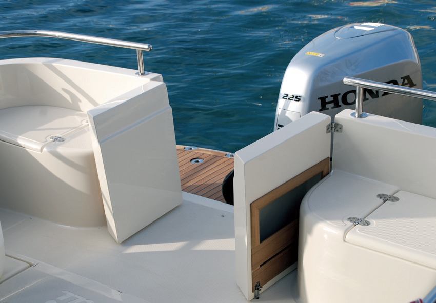 Leidi 800 je pravi mađioničar, bar što se prostora tiče, jer unutar trupa dugog 6,99 metara ima toliko mjesta kao na gotovo metar dužoj barci. U krmi pravokutnog kokpita u samim bokovima smještene su dvije manje klupe s pretincima. Razlike u odnosu na brodsku verziju započinju od krme gdje je na vrhu platforme po sredini postolje za izvanbrodski motor. U odnosu na varijantu s brodskim motorom i osovinskim vodom, ugradnjom izvanbrodskog motora na posebni nosač vodna linija je produžena četrdesetak centimetara. Usprkos činjenici da je platforma djelomično smanjena zbog motora prostora je još uvijek i više nego dovoljno za boravak i ulazak i izlazak s kopna. Umjesto motora, u podnici kopita sada se nalazi spremnik goriva od 270 litara i suha spremišta.