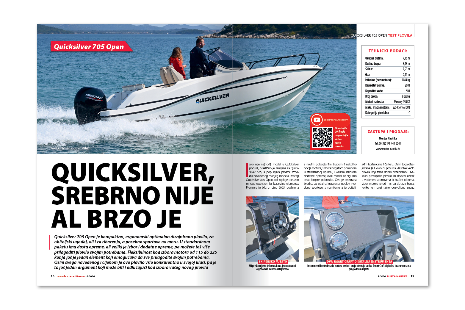 Za zaključiti je da je Quicksilver 705 Open, koji nam je ustupljen na test, otvorena dnevna brodica. No u konzoli se krije ne tako mala kabina. A iznenađenja kod ove brodice ima još.