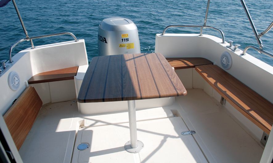 Kokpit je stvarno velik, a o odabiru motora ovisi hoće li biti više ili manje prostran. Naime, ako je na krmi ovješen izvanbrodski motor kokpit je doista ogroman, dok kod verzije s brodskim motorom iskoristivi je prostor poprilično smanjen zbog kutije motora. Tako u "izvanbrodskom slučaju" u središnjem dijelu kokpita ima više mjesta za stol. Obje verzije imaju preklopne bočne klupice koje se mogu sklopiti onda kada se ne koriste, čime ostaje više mjesta za kretanje kokpitom. Za hladovinu tijekom vrućih ljetnih dana brine se bimini tenda na inoks konstrukciji koja prekriva cijeli kokpit. Mjesta ima i u unutrašnjosti, a ovo je jedno od rijektih plovila u klasi koje nudi jednako mnogo prostora u kabini i kokpitu, bez kompromisa.