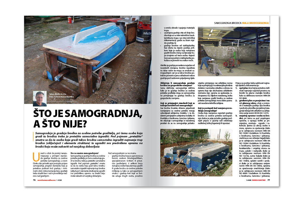 Samogradnjom brodice se smatra gradnja brodice za osobne potrebe graditelja, pri čemu osoba koja gradi tu brodicu treba ju pretežito samostalno izgraditi. O ovome „pretežito” vam pišemo u članku o samogradnji i svim važnim zakonskim normama