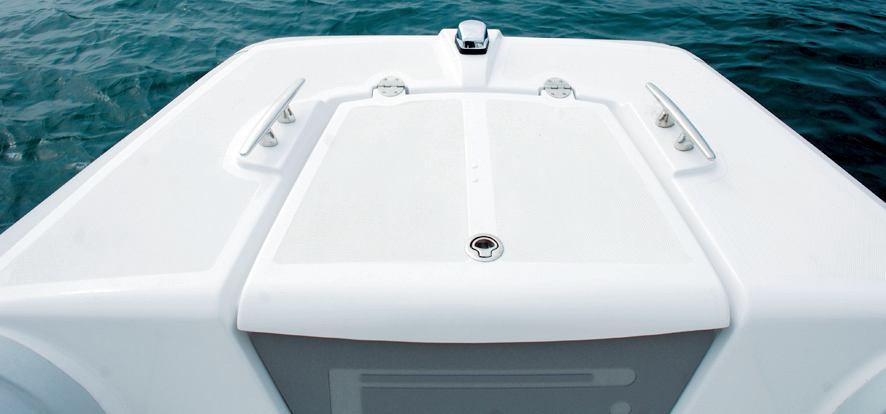 Pramčani se dio lagano izdiže tako da štiti unutrašnjost od špricanja, a širina od skoro jednog metra znatno olakšava ukrcaj i iskrcaj preko pramca. Sam vrh pramca je ravna stakloplastična ploha, koju bismo mogli nazvati radnom palubom. Izvrsna je za obavljanje svih poslova prilikom pristajanja. Središnji dio pramčane plohe je poklopac pramčanog spremišta, a bočno od njega su dvije bitve zadovoljavajućih dimenzija za siguran i čvrst vez ovog, ipak devet metara dugog gumenjaka. Jedina mala zamjerka odnosi se na pramčani dio, točnije na kombinirano crveno-zeleno navigacijsko svjetlo postavljeno na plohu gdje je izloženo udarcima sidra i lanca, a nezgodno je i ako stanete nogom na njega.