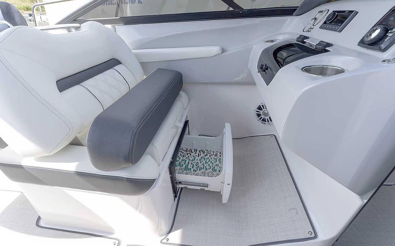 Naslon obje sjedalice je pomičan tako da ga se može pomaknuti prema naprijed i sjediti okrenut prema krmenom dijelu. I skiperska i suskiperska sjedalica pod vjetrobranskim staklom na raspolaganju imaju koristan prostor za odlaganje stvari. Ispred suskiperske sjedalice tako se nalazi kadica za stvari s poklopcem i bravicom i dva utora za odlaganje bočica s napicima.