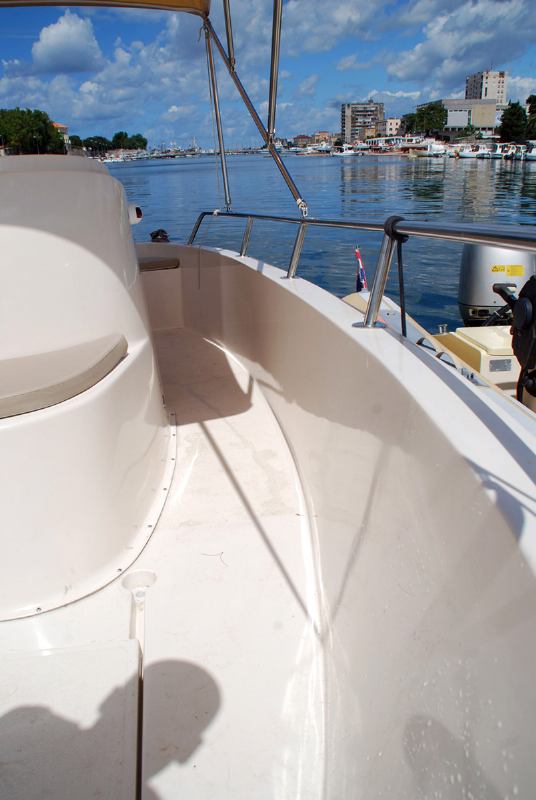 Budući da je na lijevu stranu smješten ulaz u manju kabinu, ili veće spremište, ovisno o namjeni koju joj nadjene vlasnik, skiperski pult je smješten uz desni rub. Prilično je jednostavan, ali funkcionalan i pregledan. Na njemu su instrumenti logično raspoređeni, s motornim instrumentima na najvišoj poziciji, i panel s prekidačima. Kod testirane brodice na mjesto magnetskog kompasa postavljen je konzolni nosač za ploter. Skiperska klupa za dvije osobe na testiranoj inačici bila je bez naslona što prilično umanjuje komoditet ali to ne možemo navesti kao manu s obzirom na to da se može ugraditi kao opcija.